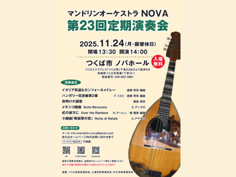 2025年11月24日(月・振替休日)ノバホールで、つくば市を中心に活動するマンドリンオーケストラNOVAの第23回定期演奏会が行われます。 曲目は、イタリア民謡&カンツォーネメドレー 遠藤秀安 編曲、ハンガリー狂詩曲第...