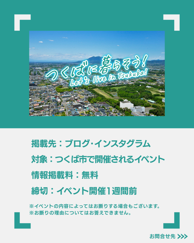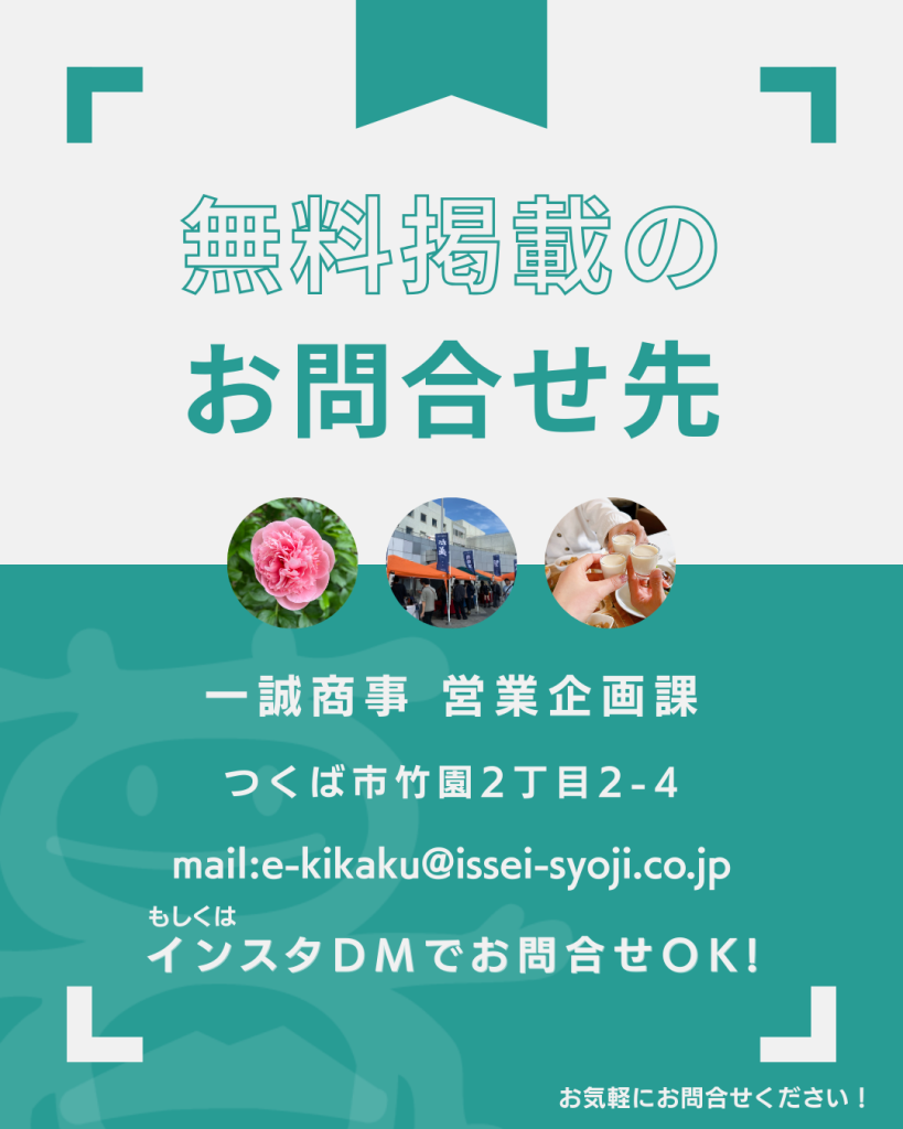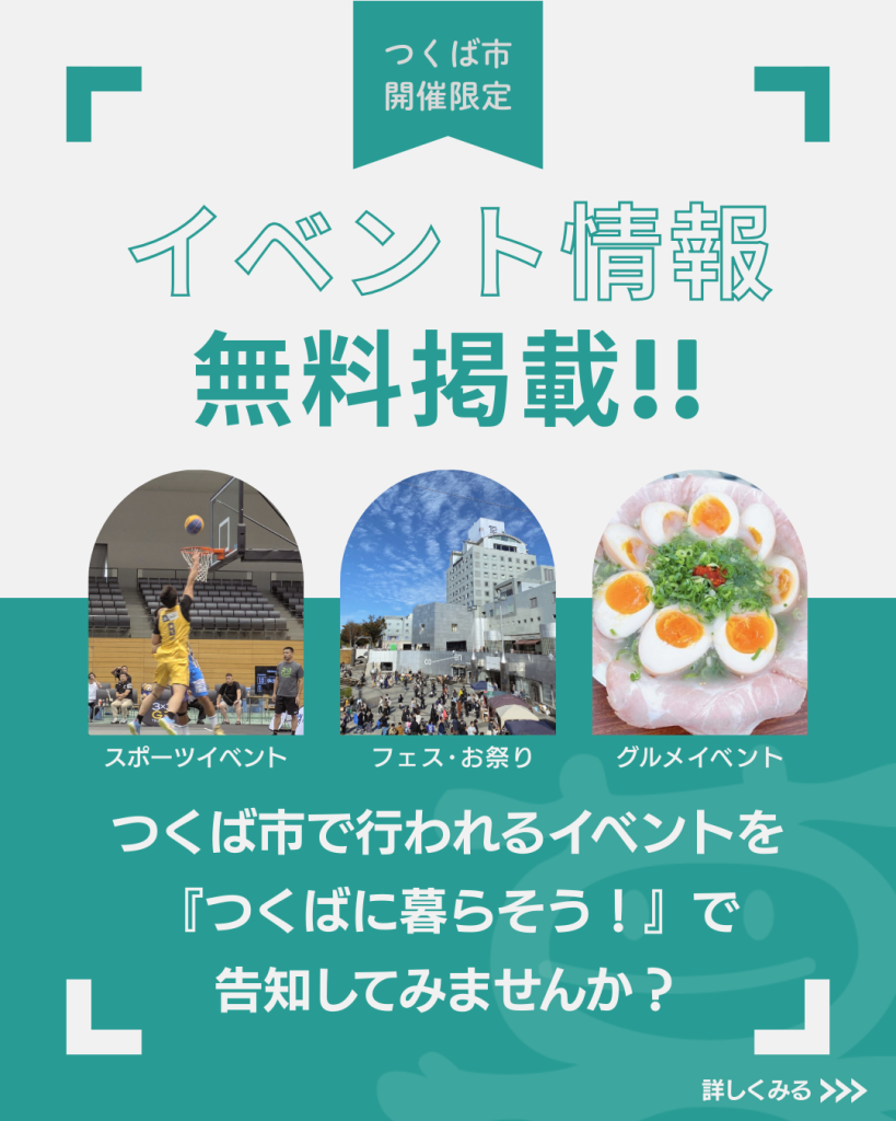 つくば市で開催されるイベント情報の無料掲載依頼や、おすすめのお店情報もお待ちしています。詳細はこちらをご覧ください。
