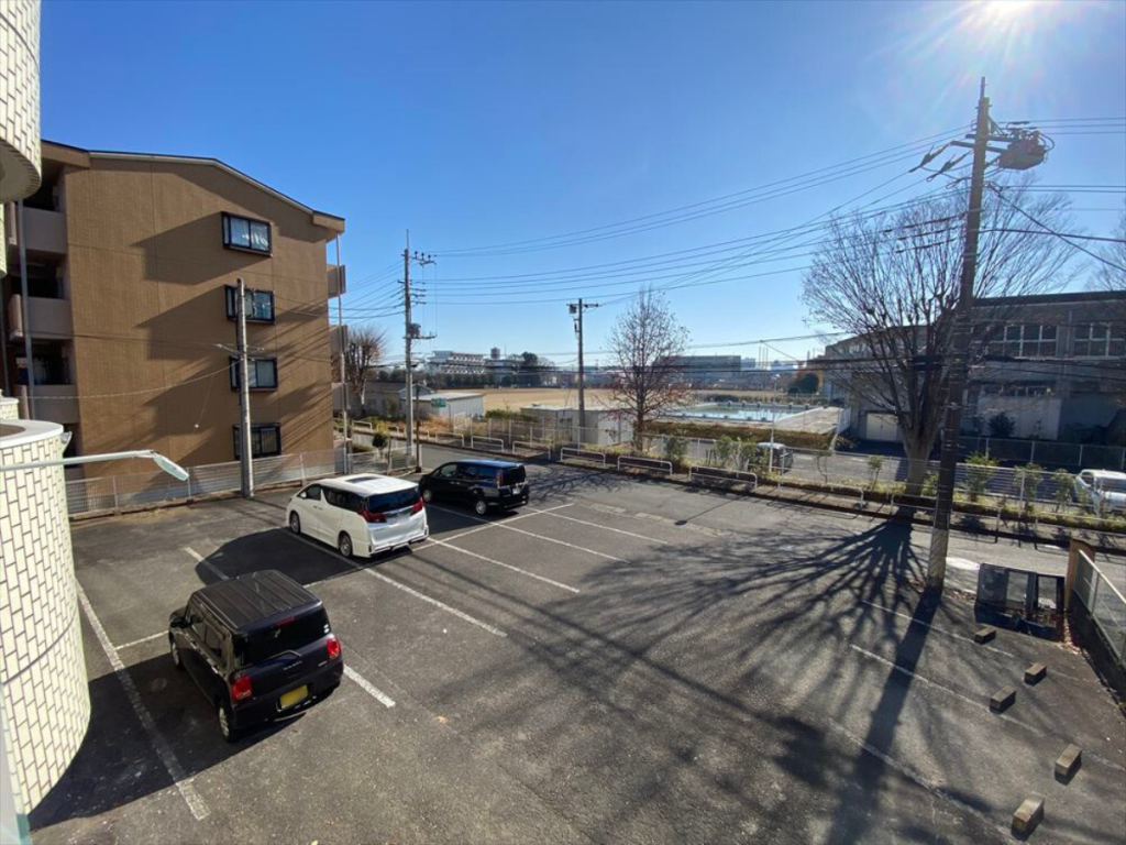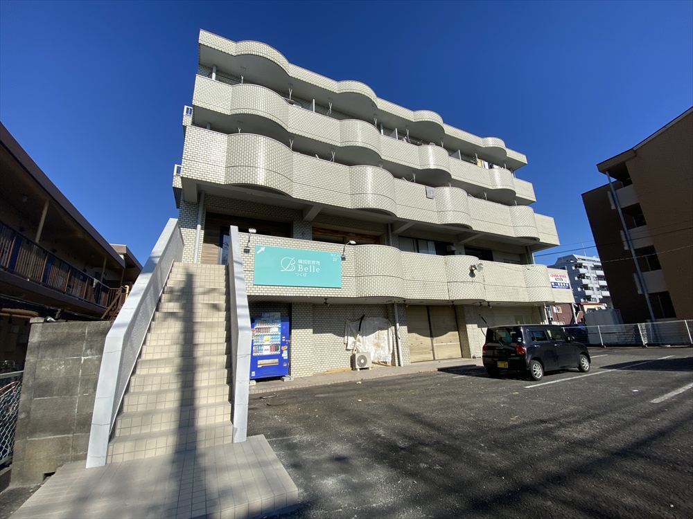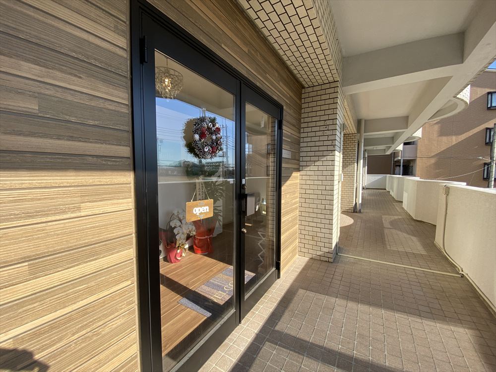 建物の前面が共有駐車場で、15台ほど停められるようになっています。駐車場が広く、車での来店も安心。階段を上がって2階が店舗です。