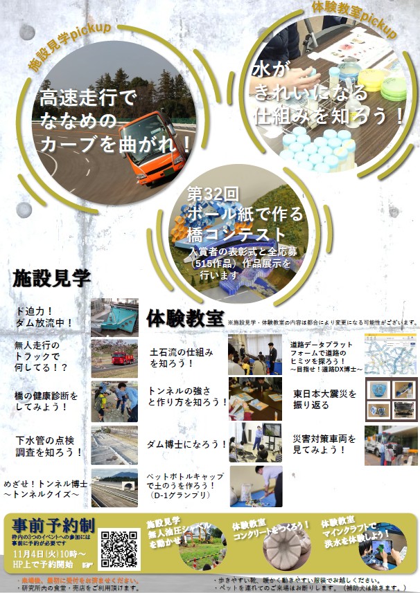 普段見ることができない実験施設の見学や、楽しく土木を学べる体験教室に参加でき、お子さんから大人の方まで楽しめる企画もたくさん予定されているとのこと!