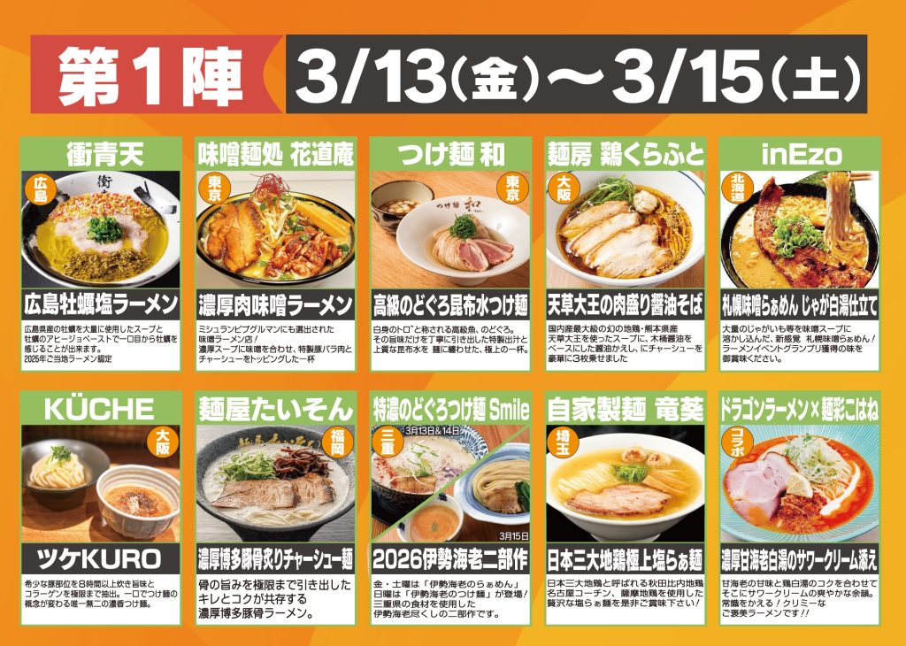 会期は第1陣(3月13日(金)〜15日(日))と第2陣(3月19日(木)〜22日(日))の2期に分かれており、期間中は全国から選ばれたラーメン店が出店。コラボ出店を含む全20ブースが、こだわりの一杯を提供します。