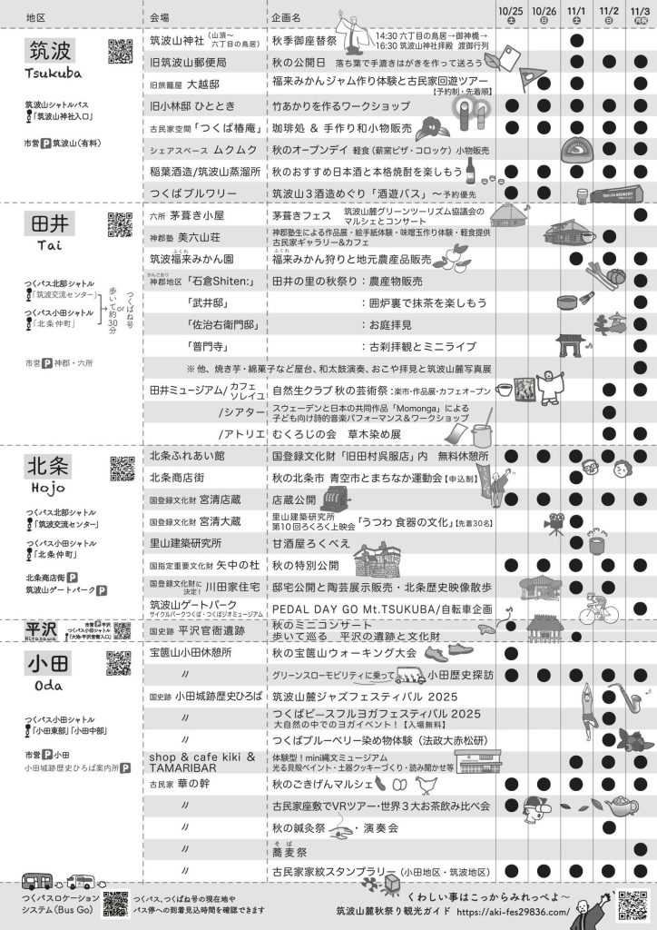 筑波山麓の歴史と文化を楽しむ秋のイベントで、筑波、田井(神郡・臼井)、北条、平沢、小田の5地区で様々なイベントが開催されます。