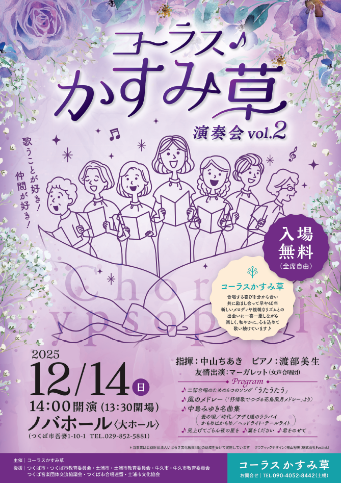 2025年12月14日(日)、ノバホールでコーラスかすみ草の演奏会vol.2が行われます。