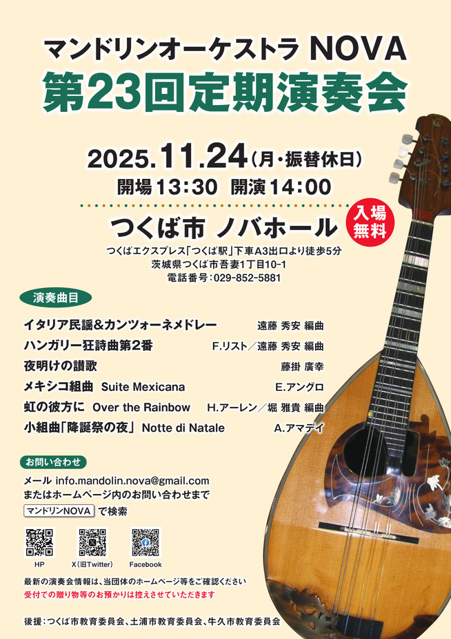 2025年11月24日(月・振替休日)ノバホールで、つくば市を中心に活動するマンドリンオーケストラNOVAの第23回定期演奏会が行われます。