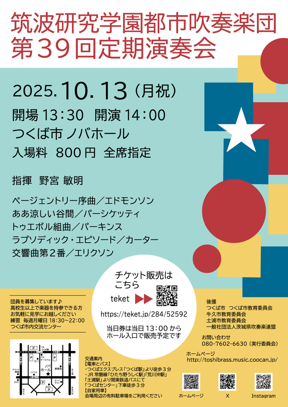 2025年10月13日(月・祝)、ノバホールで筑波研究学園都市吹奏楽団の第39回定期演奏会が行われます。