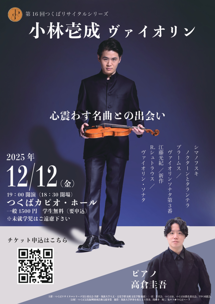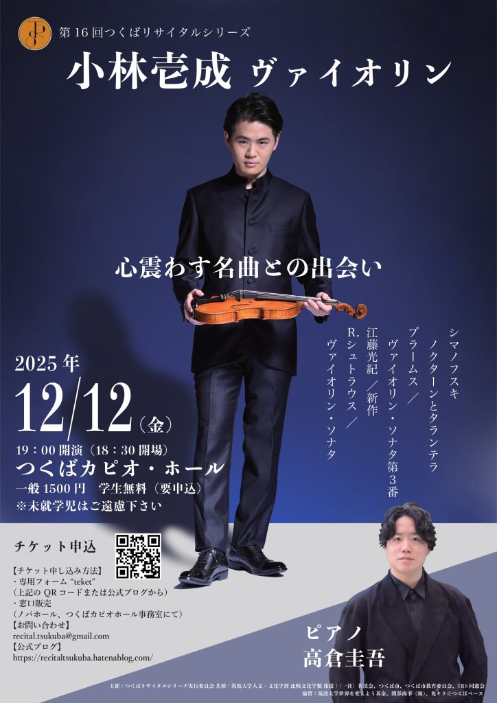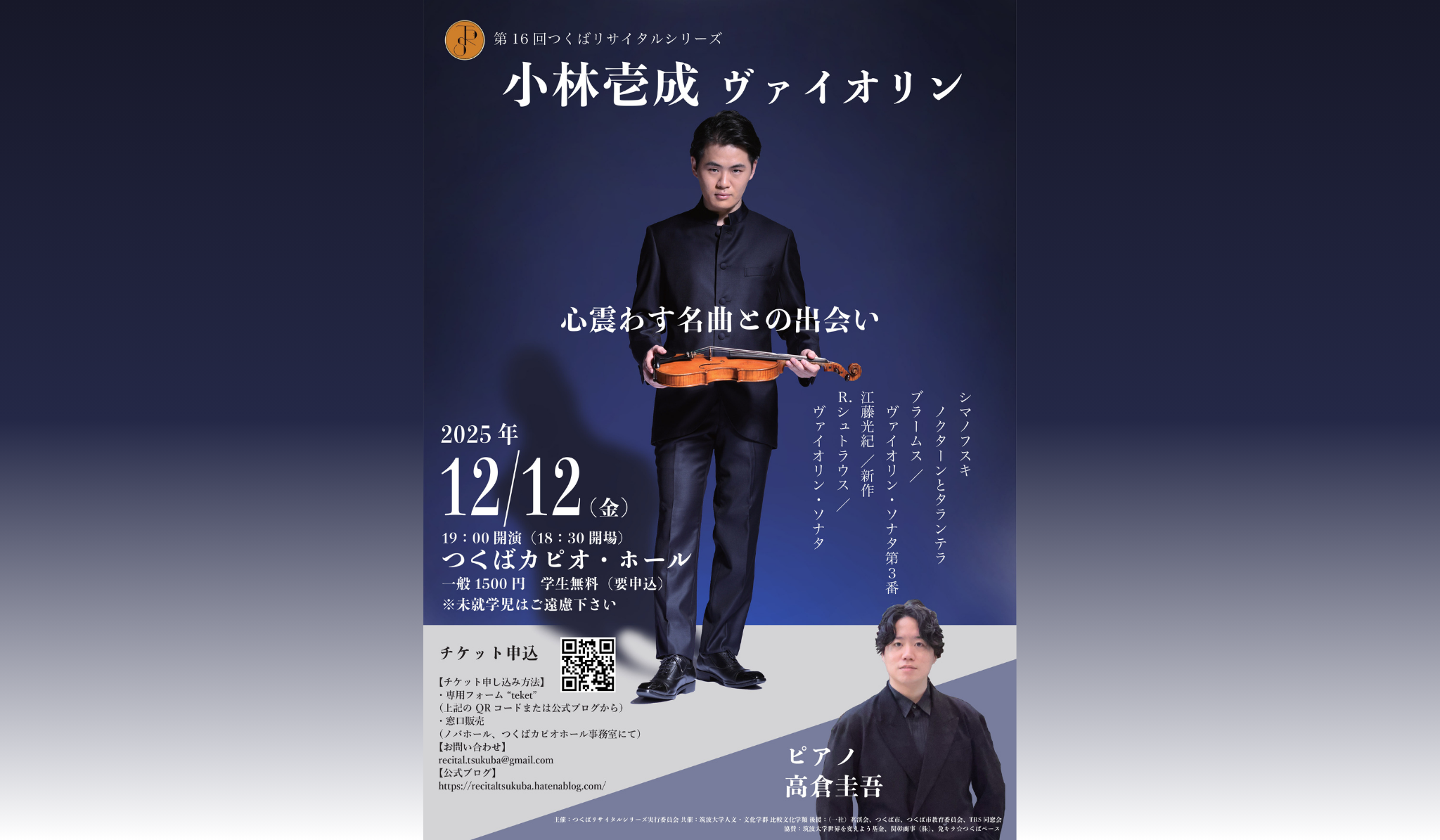 2025年12月12日(金)、つくばカピオホールで第16回つくばリサイタルシリーズ「小林壱成ヴァイオリン 心震わす名曲との出会い」が行われます。
