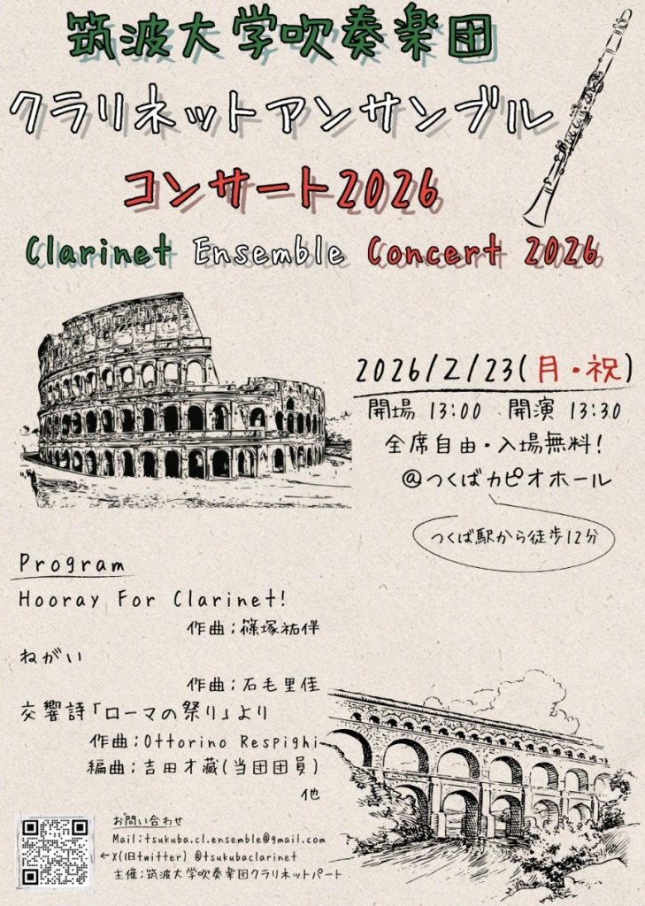 2026年2月23日(月・祝)、つくばカピオに於いて『筑波大学吹奏楽団 クラリネットアンサンブルコンサート2026』が開催されます。