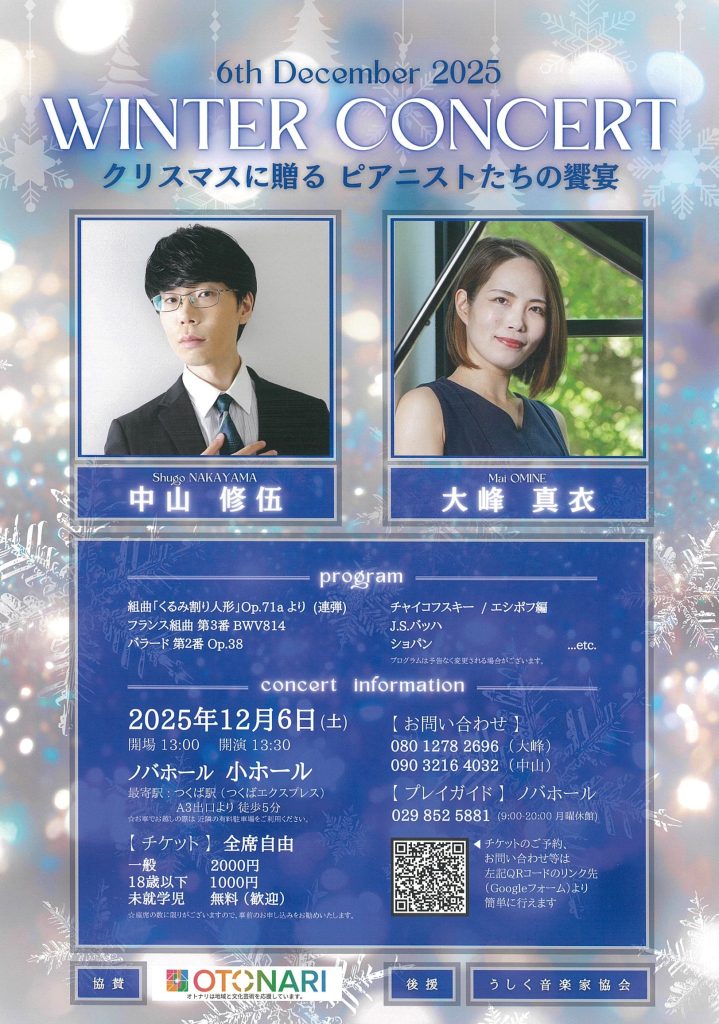 2025年12月6日、ノバホール(小ホール)で『ウィンターコンサート クリスマスに贈るピアニストたちの饗宴』が行われます。