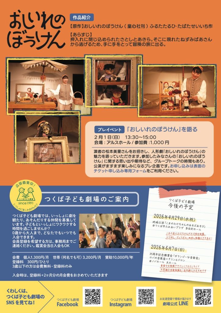 なお、2026年2月1日(日)にはアルスホールでプレイベント『「おしいれのぼうけん」を語る』も行われます。人形劇・プレイベントともに詳細はつくば子ども劇場のInstagramにてご確認ください。