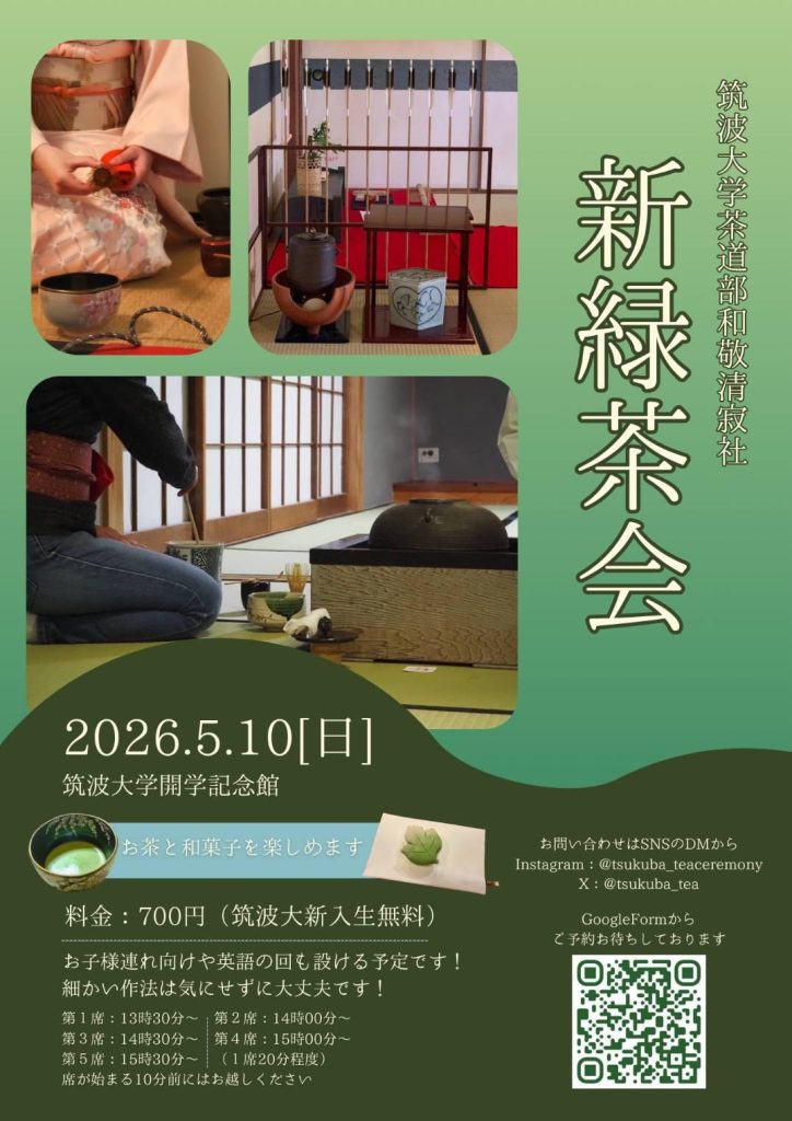 2026年5月10日(日)、筑波大学茶道部 和敬静寂社主催の新緑茶会が筑波大学開学記念館で行われます。