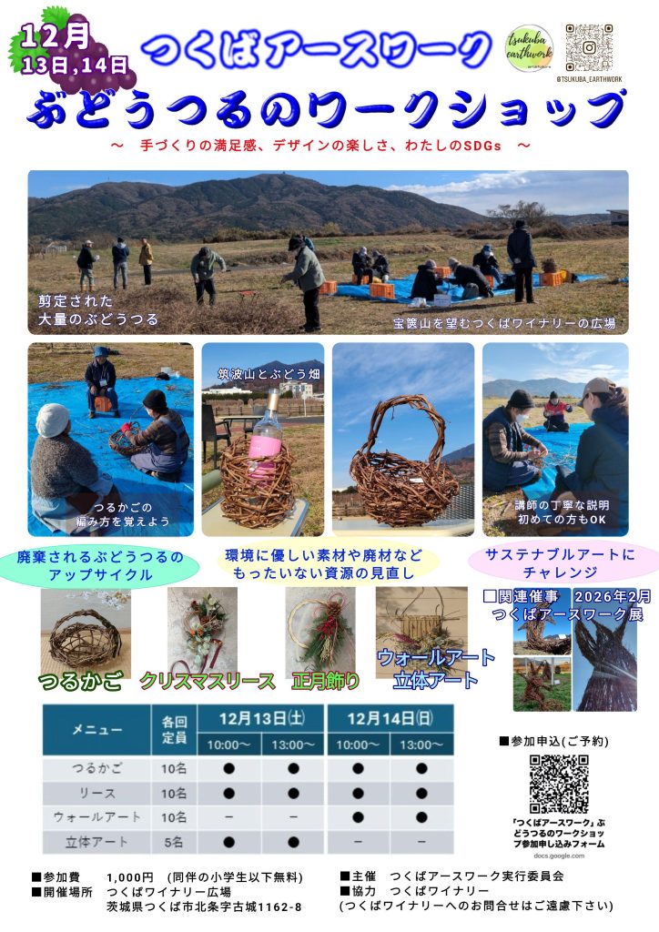 ぶどうつるの立体アートワークショップ(13日)や、ウォールアートワークショップ(14日)、も行われる予定で、2026年2月に開催予定のつくばアースワーク展に向け、造形の基本や裏技を学び、作品を試作することもできます。