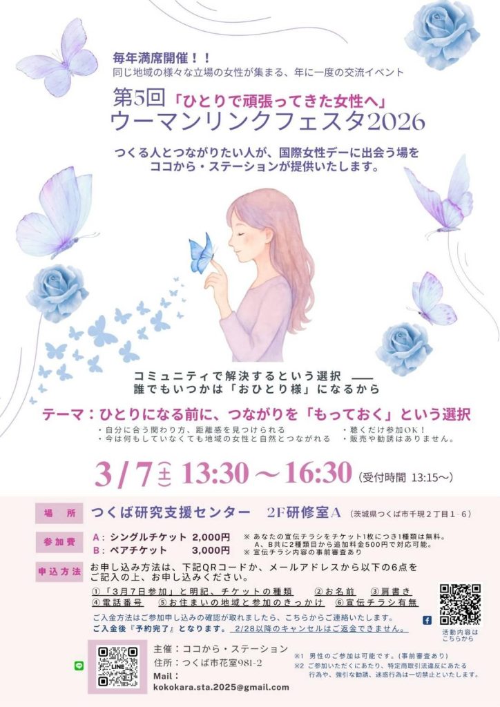 2026年3月8日の国際女性デーにあわせて行われるもので、地域で活動する女性や、これからの生き方を考えたい女性たちが立場や世代を越えて集い、「つながりを持って生きること」をテーマに、学びと対話を行う、年に一度の交流イベントです。