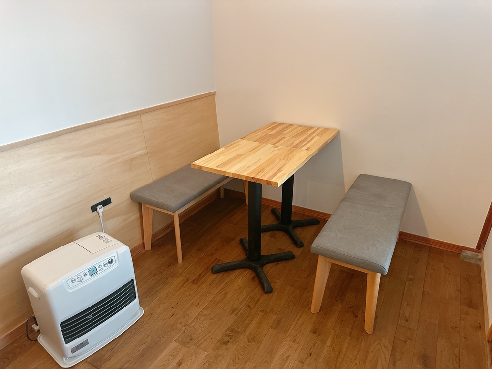 写真のようなイートインスペースもあります。小さな子どもがいても周りを気にしなくて済むのがうれしい。ベンチシートとテーブルの組み合わせで、冬はストーブが置かれていて、寒い日もほっと一息つけます。