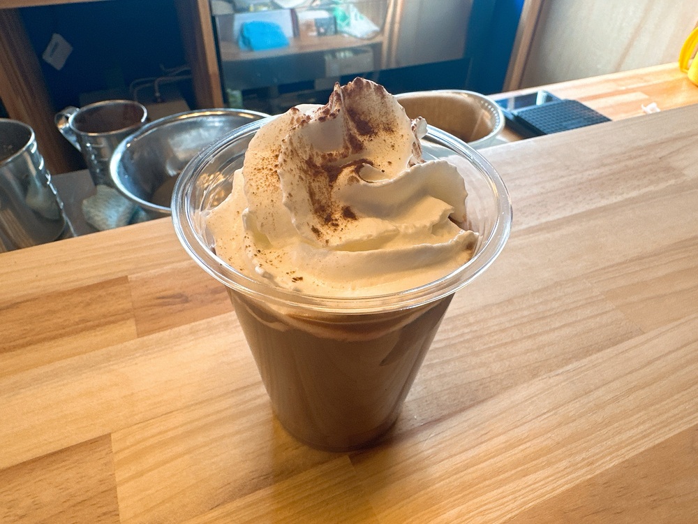 ふんわりと山盛りになったホイップクリームの上にパウダーがふわっと散らされていて、見た目だけでもう満足感がある。一口飲んだら、チョコレートの濃さがしっかりあって、でも甘すぎない。