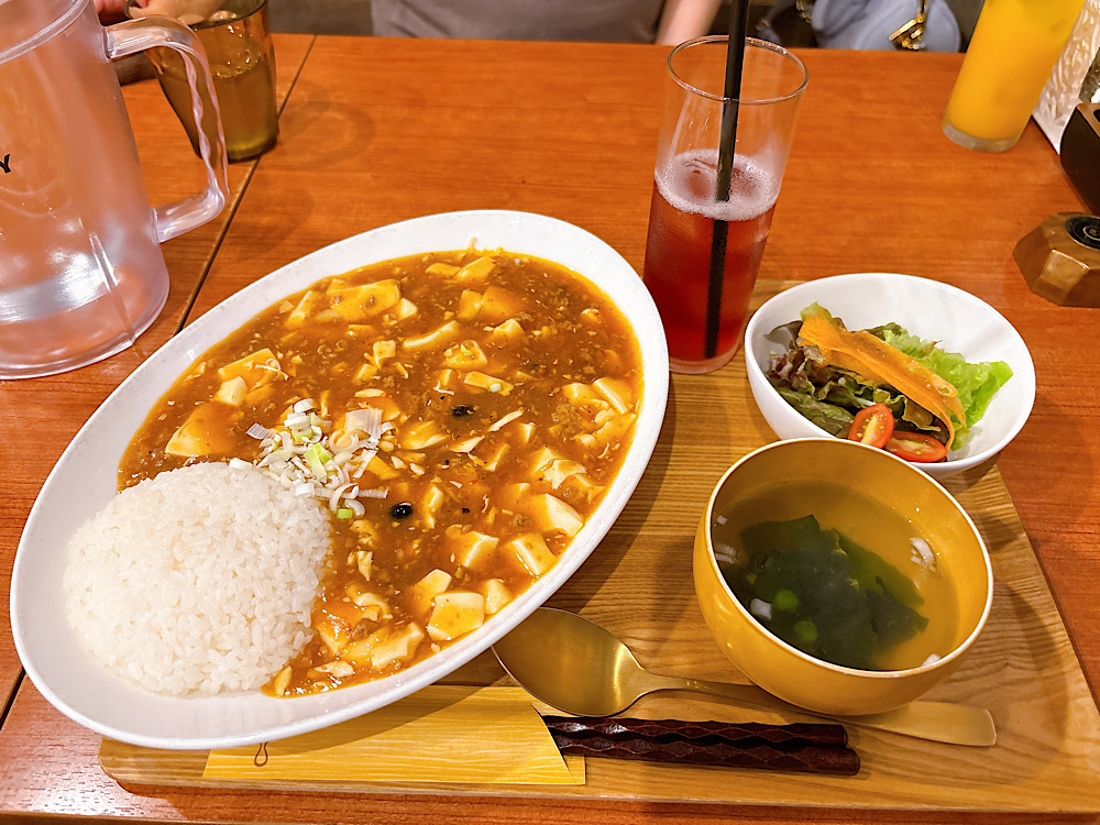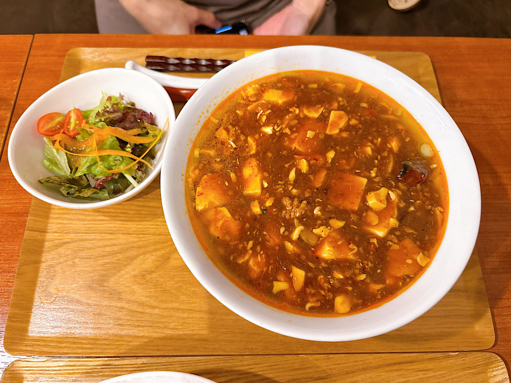 今回私は、友人が「2~3辛くらいが無理なくおいしく食べられるかな」とアドバイスをくれ、3辛の麻婆豆腐に「めし」と、サラダ&ドリンクセットも付けました。