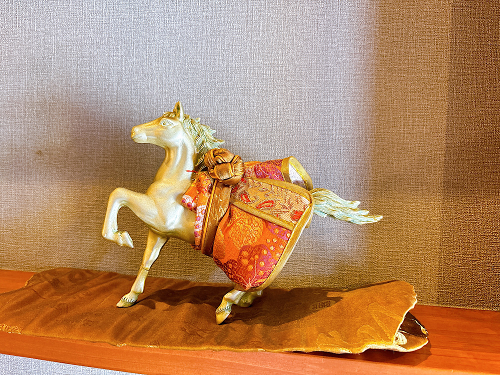 金の馬に乗ると…不思議と周囲との関係も深まり、日頃からの頑張りが認められ、大きな仕事がうまくいくなど、幸運に恵まれたり、男女問わず素晴らしいご縁に恵まれるとさ。どうか1人でも多くの方が、幸運と結ばれていきますようにと願いを込めて『金の馬結』が誕生しました。出入り口ドアの上に金の馬様がリンリンと綺麗な音色をたてながら、皆様をお見送りしております。幸運の音色でございます。皆様が幸運の音色シャワーを浴びて、今日も1日人生で最高に幸せな日になりますように……」