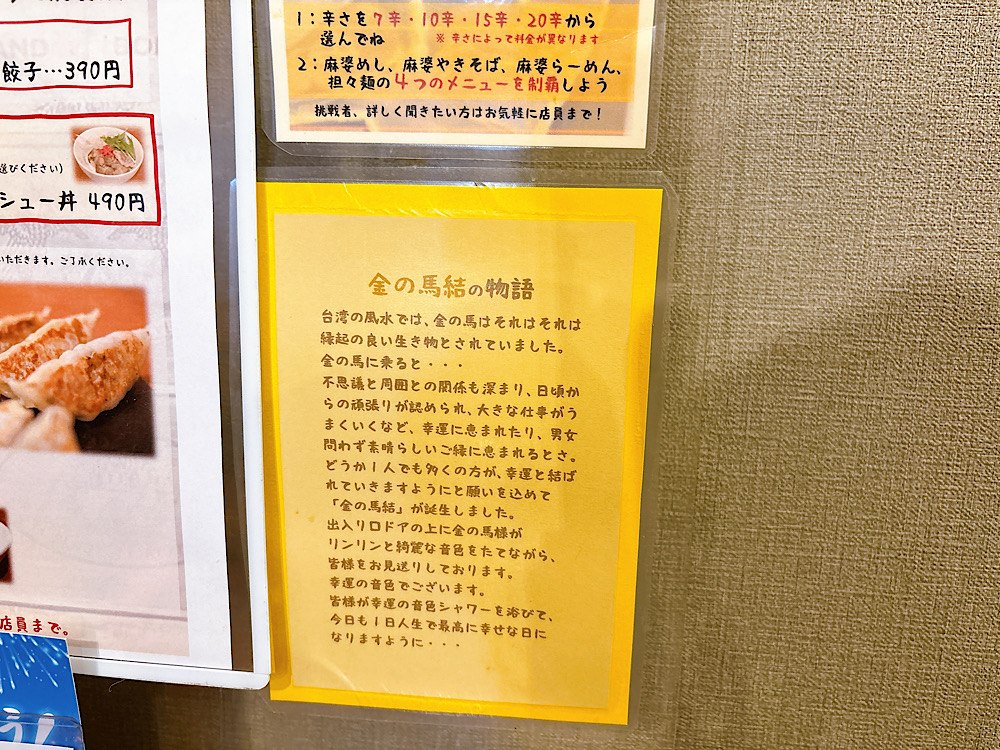 卓上には店名の由来、「金の馬結の物語」が書かれていました。