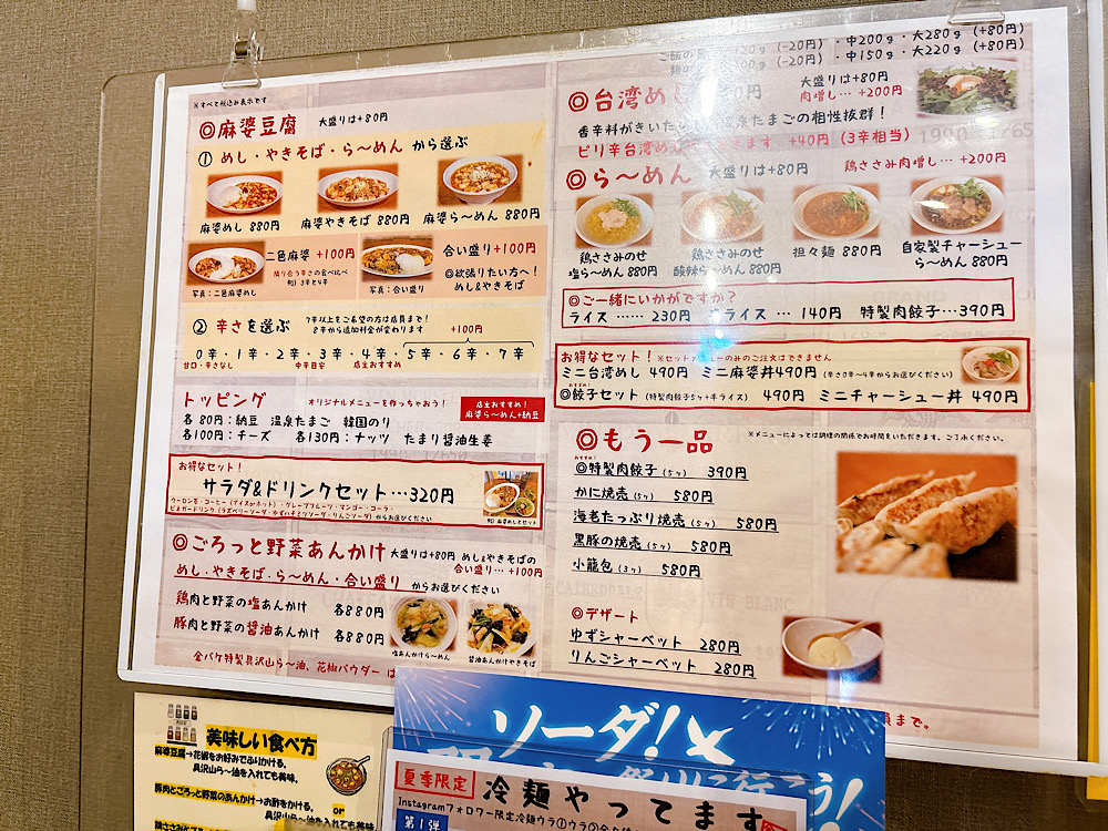 麻婆豆腐を中心に、野菜あんかけや台湾めしがあります。