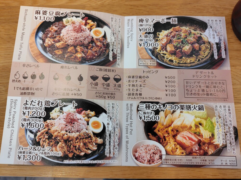 メニューを注文する際に選ぶのが、「辛さレベル」「しびれレベル」「ご飯(雑穀米)の量」です。