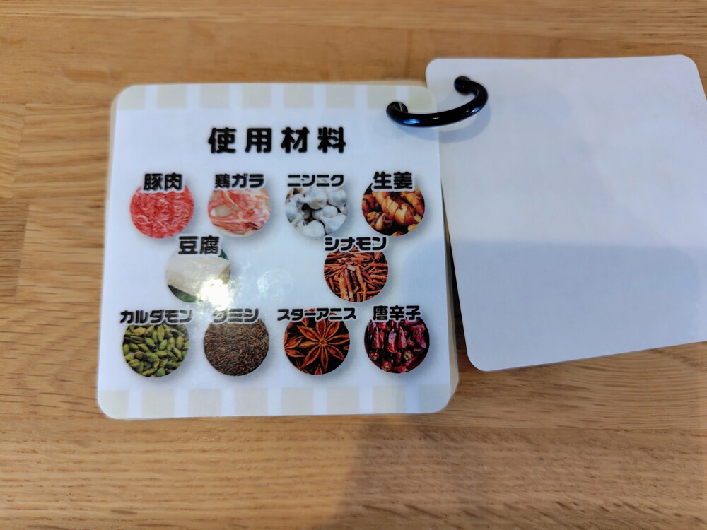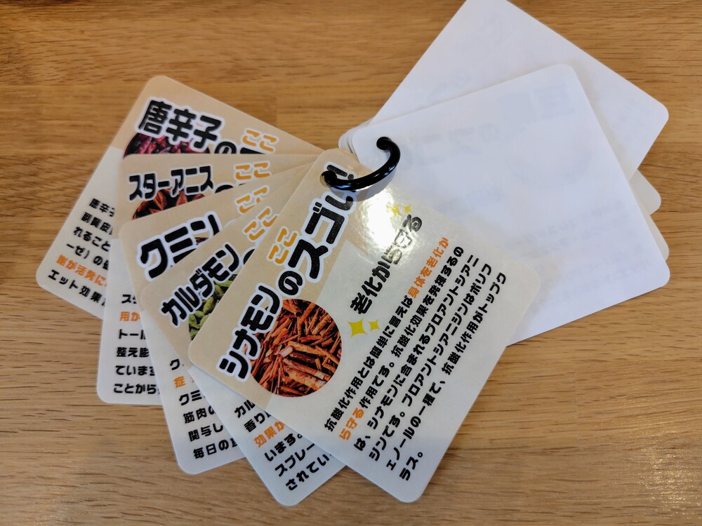 写真のメニューの横には、スパイスの効能が書かれたカードがありました。スパイスの勉強にもなって楽しいですね。