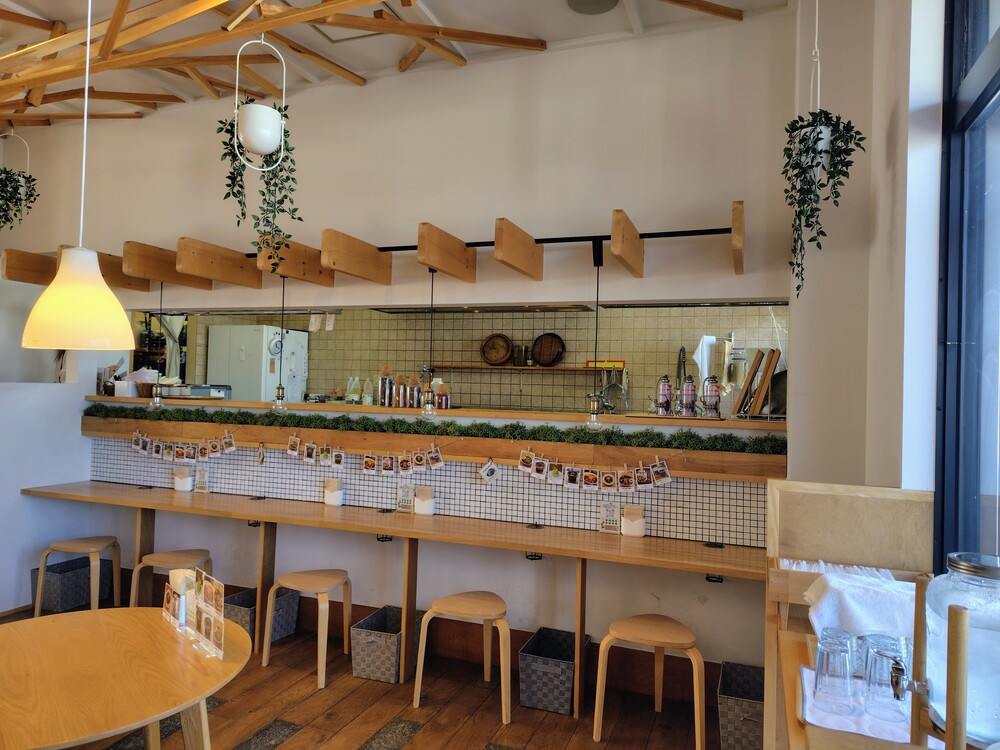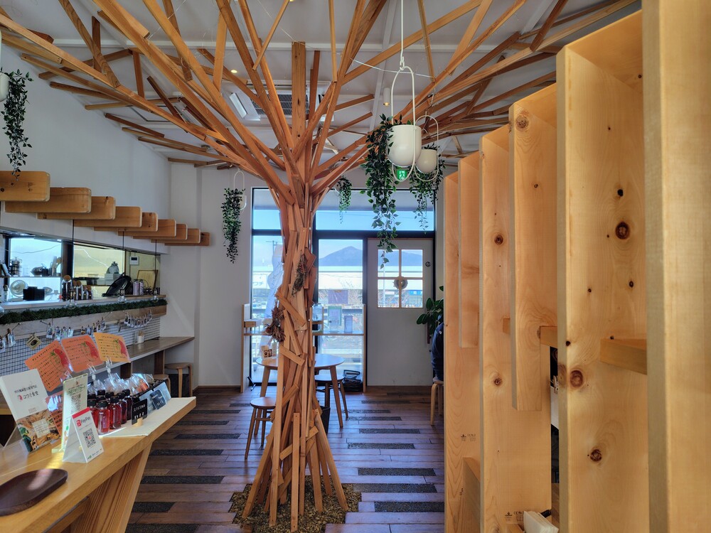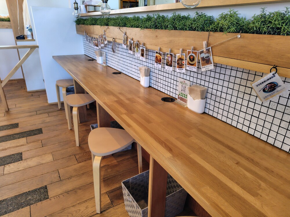 店内のテーブルやカウンター、イス、真ん中のシンボルツリーなどは木でできており、とってもおしゃれ。ジャズが流れている落ち着いた雰囲気で、まるでカフェにいるような感覚です。