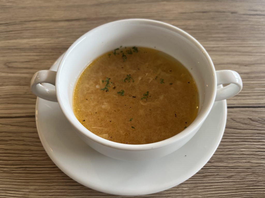 まずはセットのスープが来ました。魚介と甲殻類を使用したスープとのことで、ほんのり魚介の風味があります。具にはふんわり卵が入っていました。