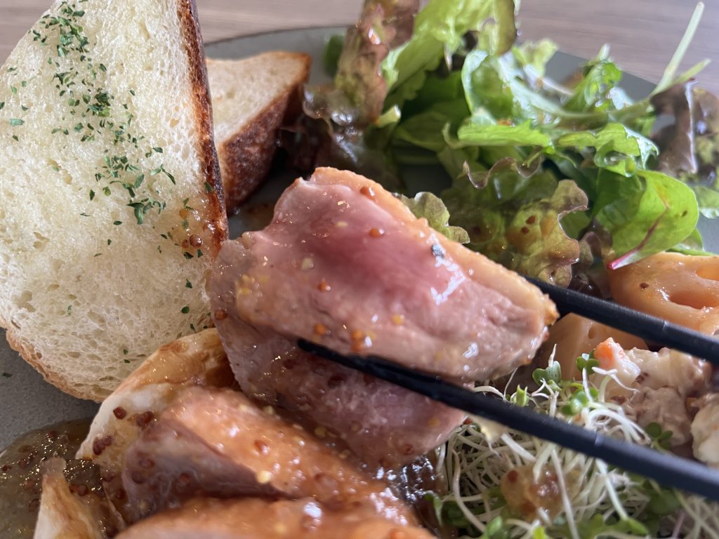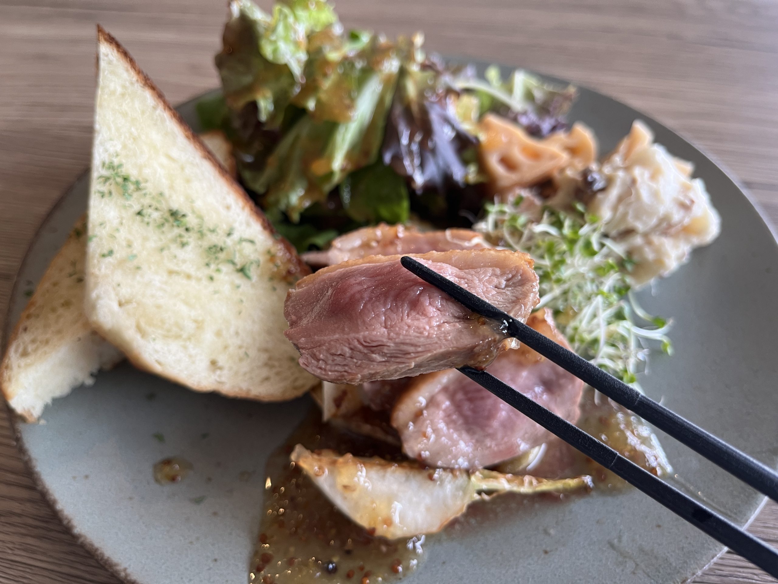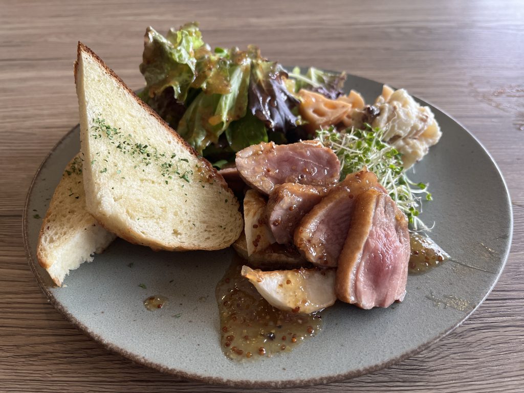 プレートには鴨と旬野菜のローストのほか、フォカッチャ、サラダ、ポテトサラダ、レンコン煮が載っています。