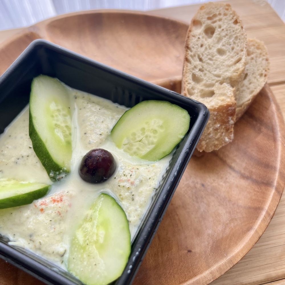 ヨーグルトとズッキーニ、ミントがベースの「ギリシャの冷製スープ(バゲット付)」は、とても爽やかで、夏の朝にぴったり!