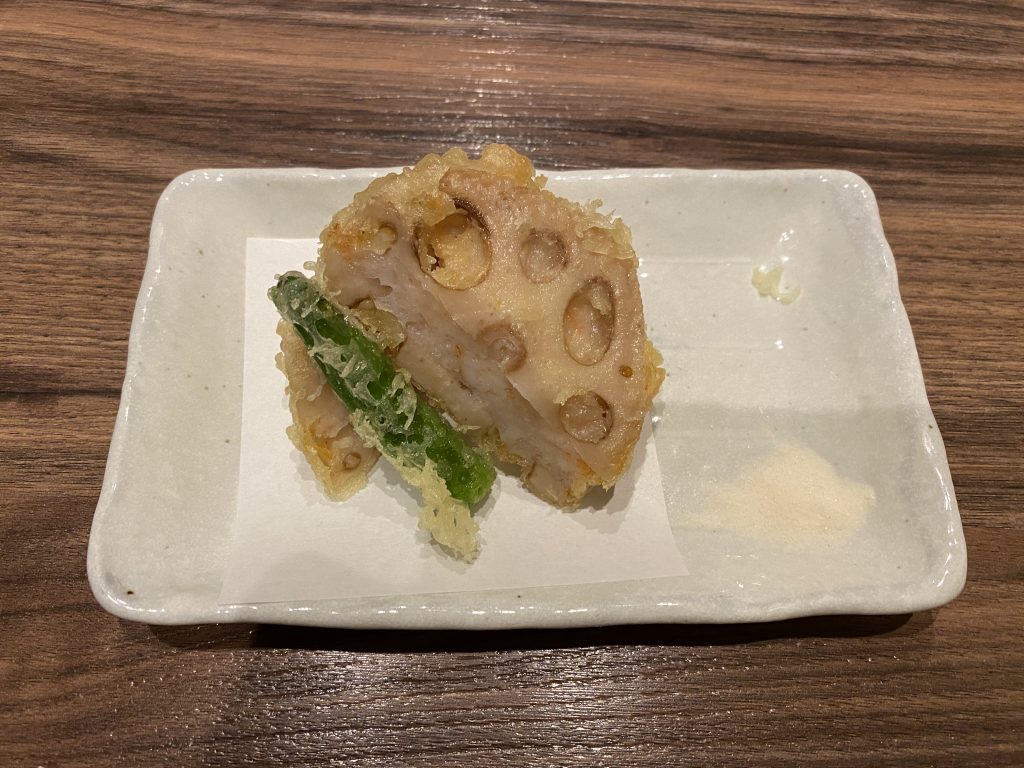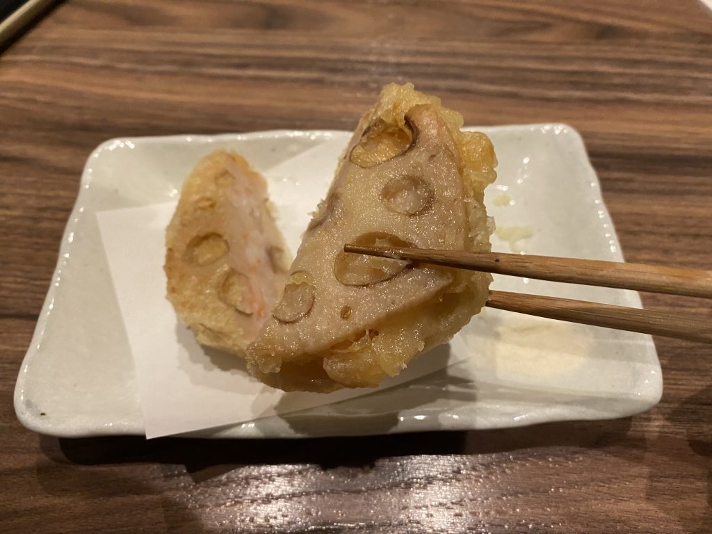 海老真丈を蓮根でサンドし、外はカリッ、中はレンコンのサクサクと海老真丈のプリプリが美味しい一品。