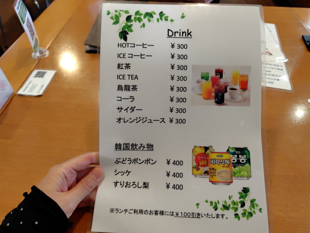 コースの内容はメイン(メニューから一つ選択)、ミニチヂミ、ミニホットック(甘いおやき)、ドリンクで1,760円とお得です。