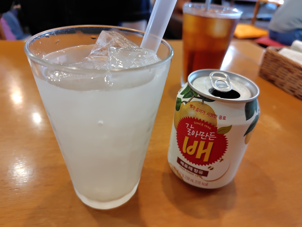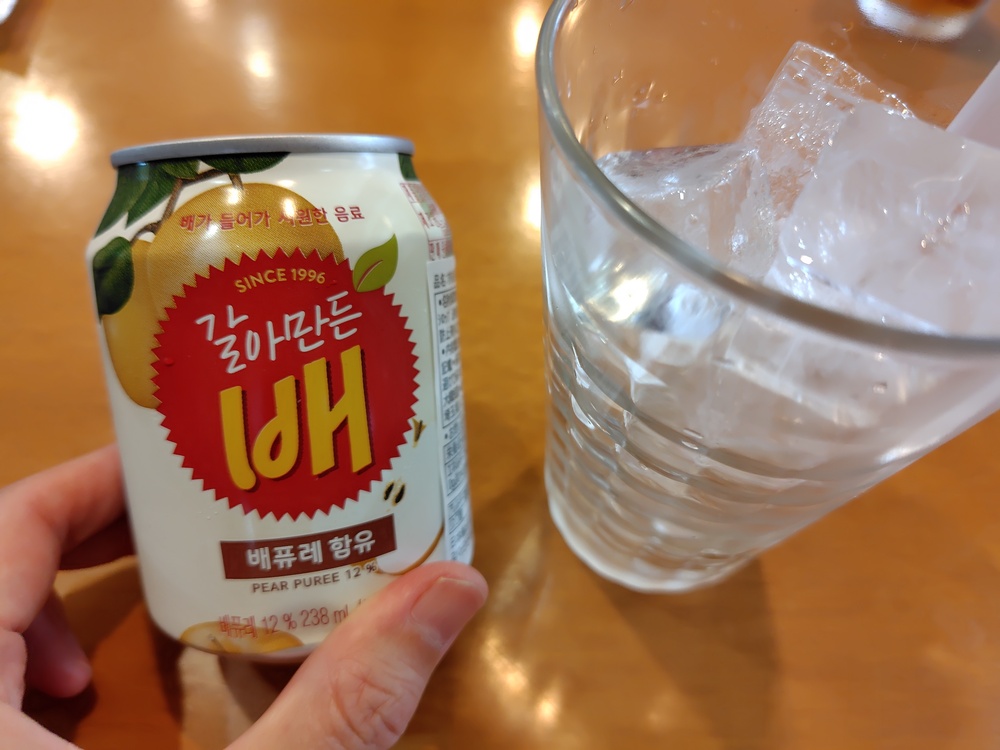 すりおろし梨は韓国で製造されたジュース缶で、お店の冷蔵庫にもズラリと並んでいました。海外の飲み物というだけで、ワクワクするのは私だけでしょうか。