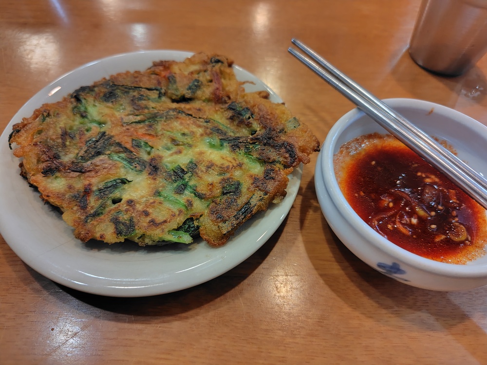 チヂミはそのままでもおいしいのですが、ネギ入りのキムチ風の甘めのタレをつけると、おいしさが倍増します。