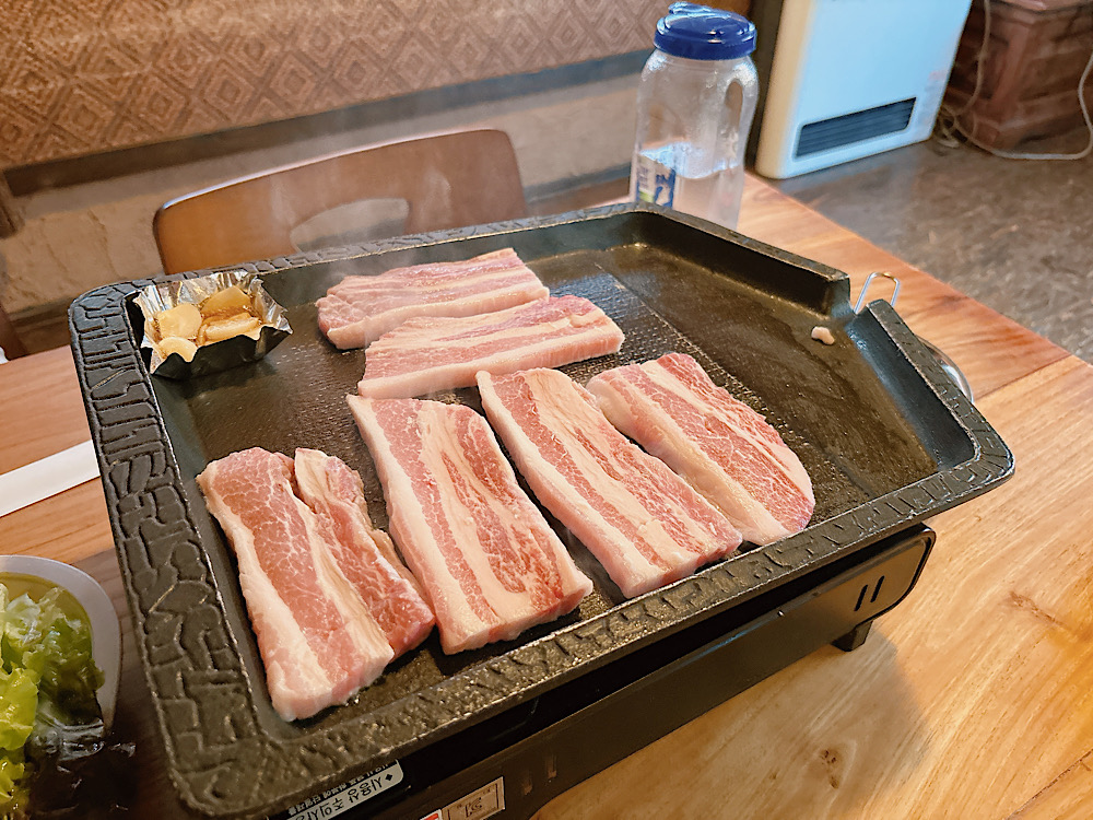 メインのサムギョプサルは、店員さんが鉄板の上で焼いてくれますので安心です!