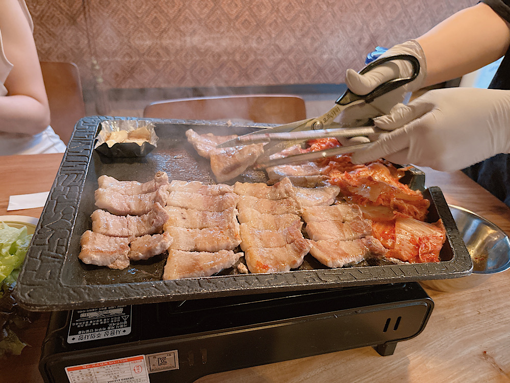 キムチやニンニクと一緒に焼いて、ハサミを使って食べやすい大きさにカットしてくれます。