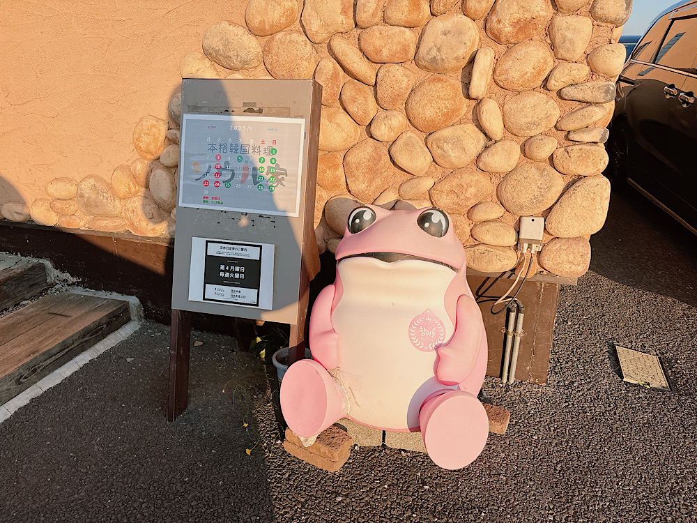 駐車場はお店の前にあります。かわいいピンクのカエルがお出迎えしてくれました。