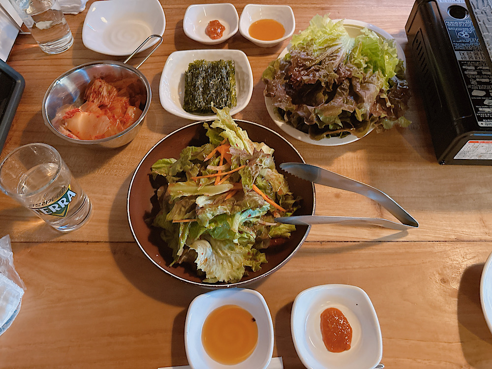 最初に来たのはサラダやキムチ、サンチュなどのお野菜類。