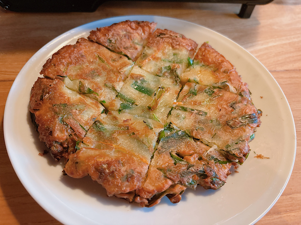 こちらはチヂミです。シーフードにしました。ポン酢やみそやコチュジャンなどで作る辛みそダレをつけて食べます。