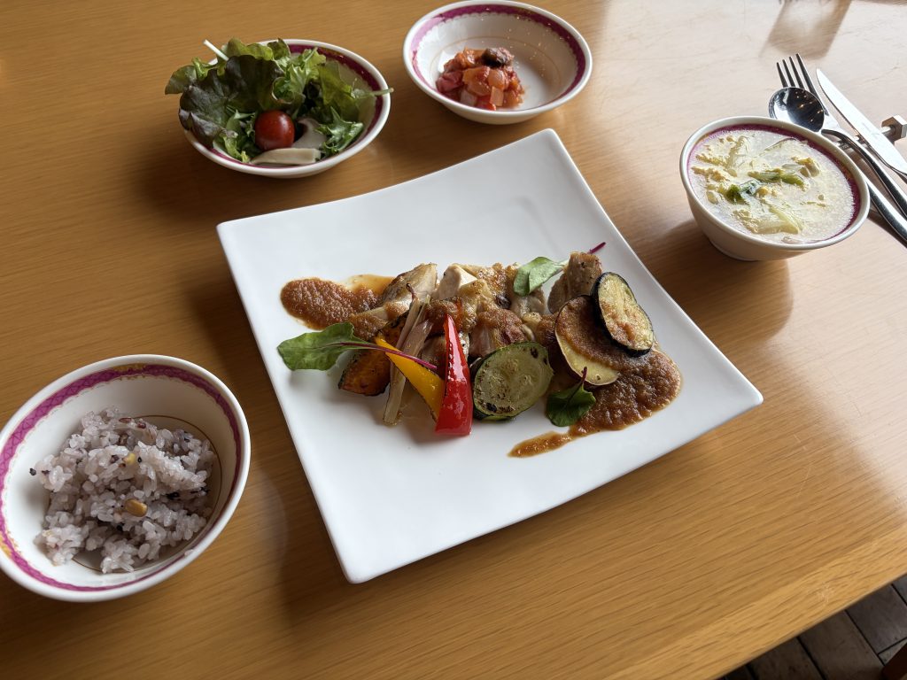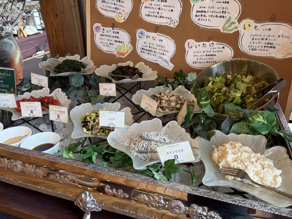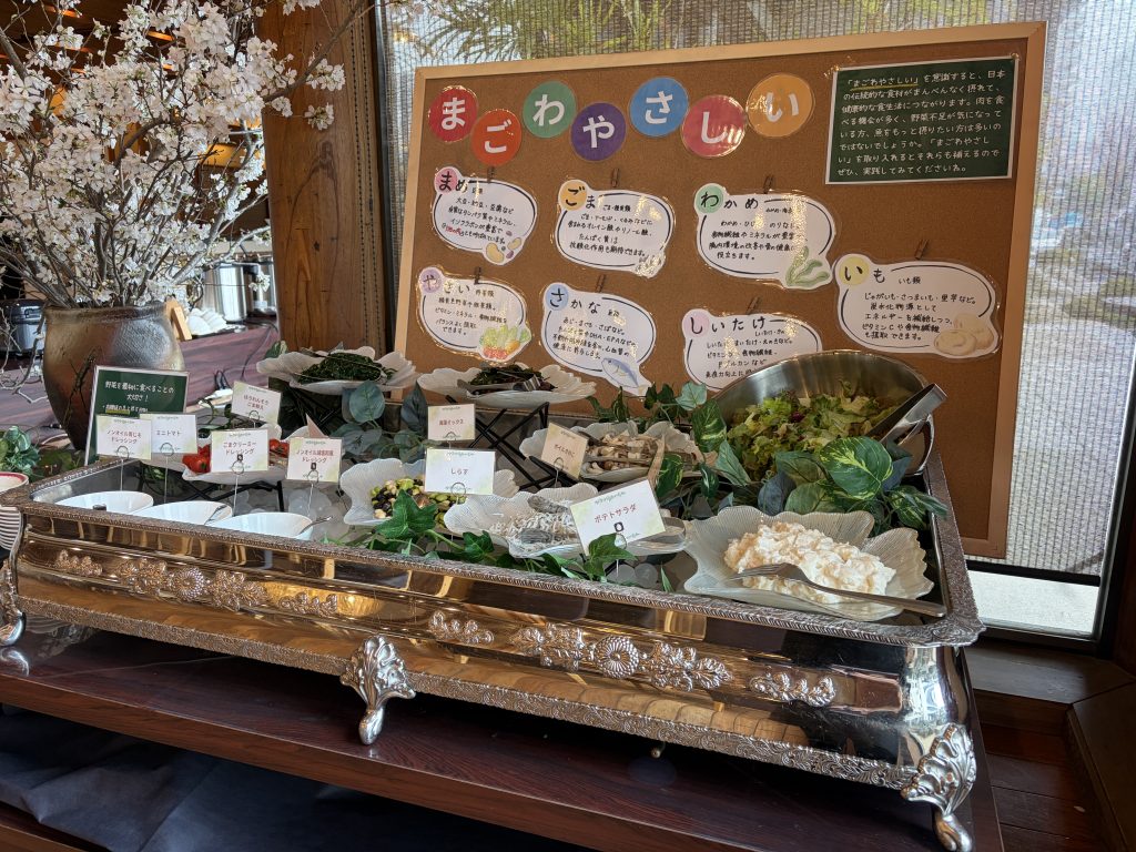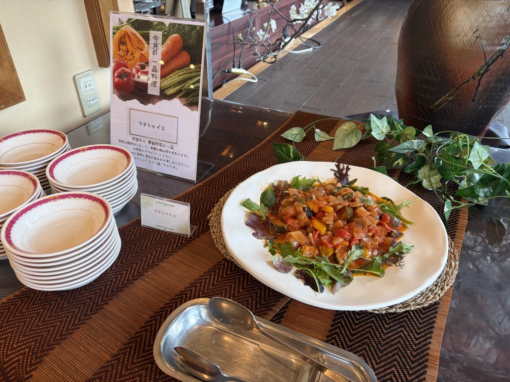 サラダバーの隣には、月替わりの季節野菜を使った一品料理。3月は「ラタトゥイユ」でした。調理法によって栄養の吸収率も変わるとのことで、食事そのものを楽しみながら学びも得られる工夫が感じられます。