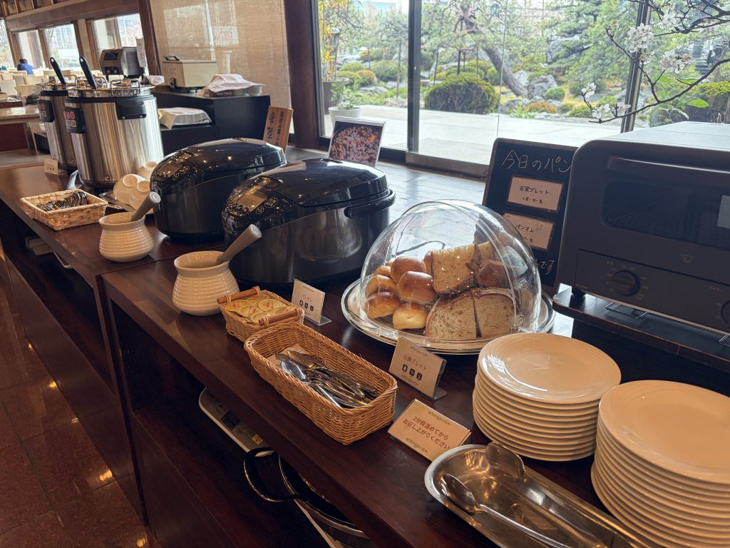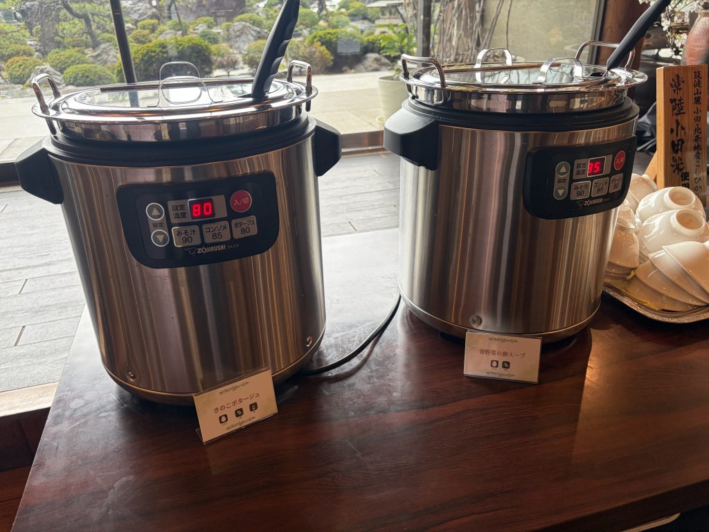 スープは2種類。「きのこポタージュ」と「春野菜の卵スープ」が用意されており、きのこポタージュは旨みが凝縮されたクリーミーな味わい、春野菜の卵スープは野菜たっぷりの中華風スープでした。