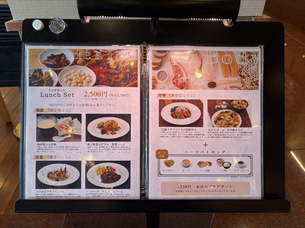 今回のお目当ては、3月2日にリニューアルされた「ハーフバイキング付き 食巡健美ランチセット」(税込2,750円)。和食・洋食・中華それぞれ2種類ずつ用意されたメイン料理の中から、好みの一品を選べます。