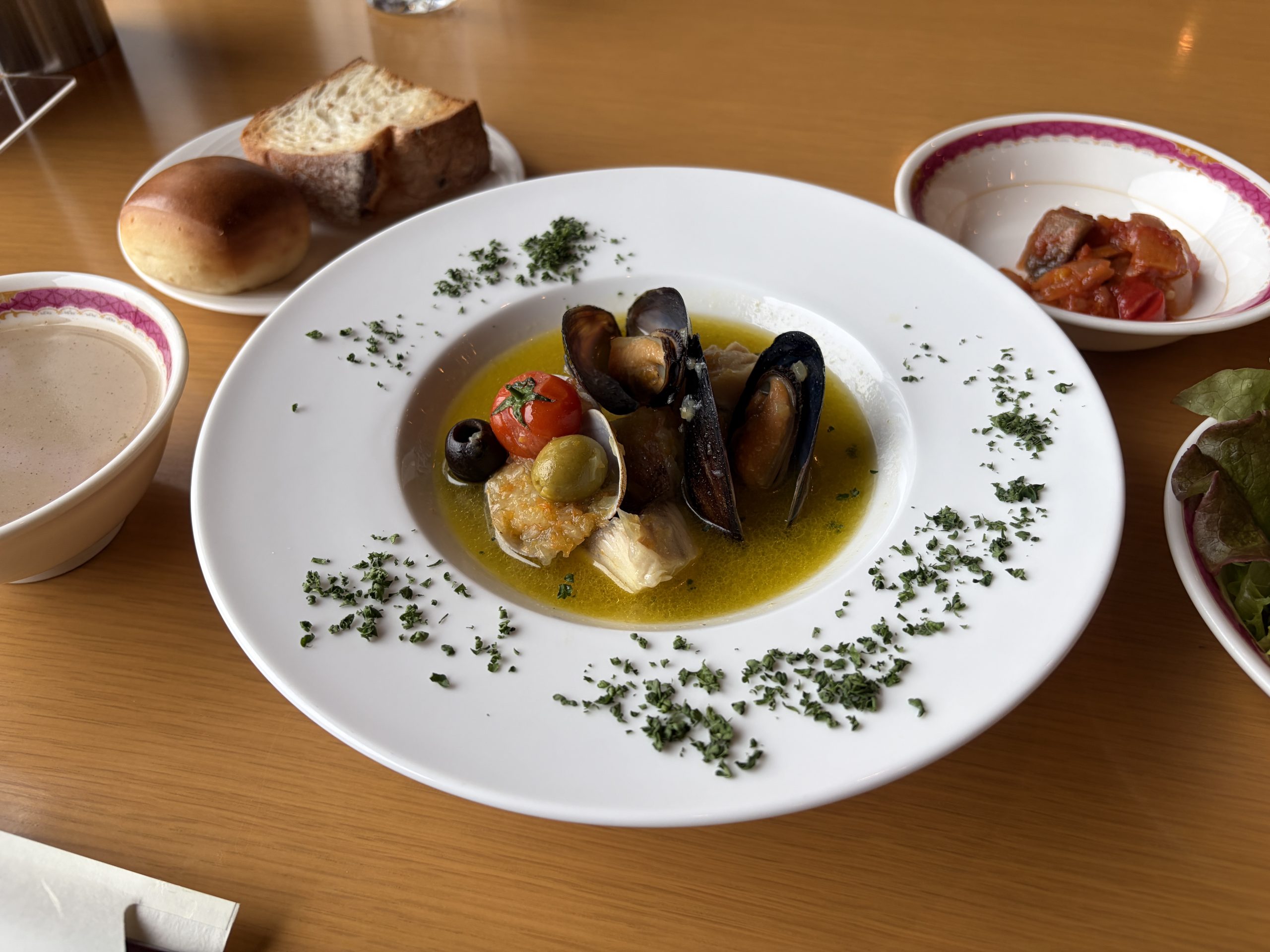 私がいただいた「メバルのアクアパッツァ」は、メバルを中心にムール貝やアサリ、オリーブ、プチトマトが彩りよく盛り付けられた一皿。魚介の旨みが溶け込んだスープが印象的で、メバルもふんわりと柔らかく仕上がっており、美味しくいただきました。