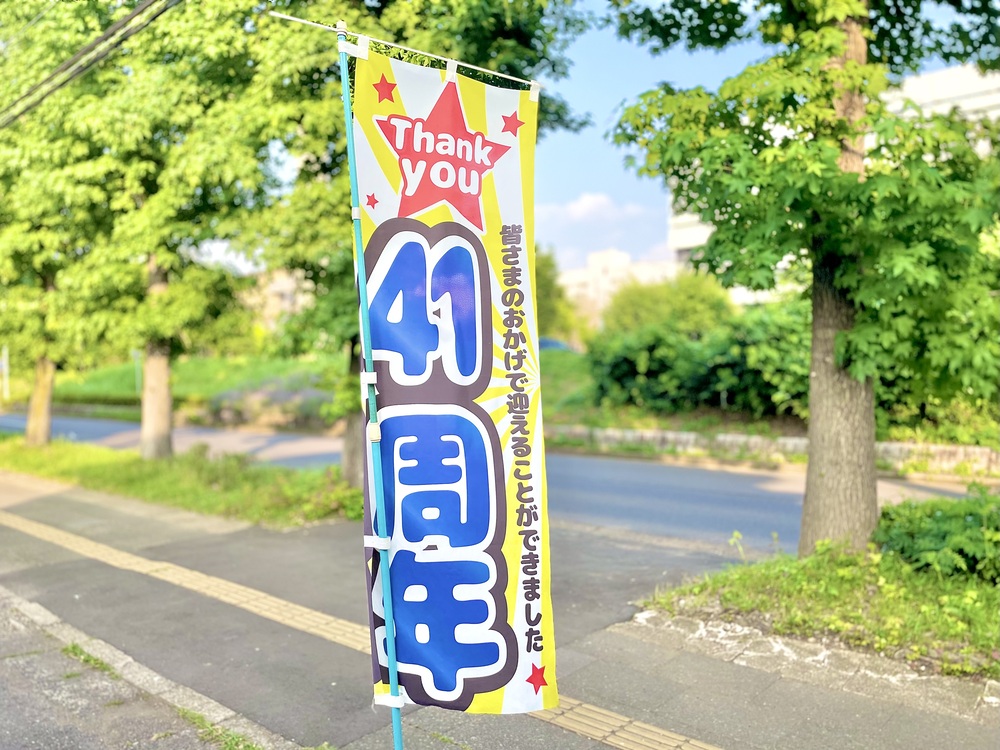 入口には「41周年」ののぼり旗が立っており、地域のお客さんに長く愛されていることがうかがえます。