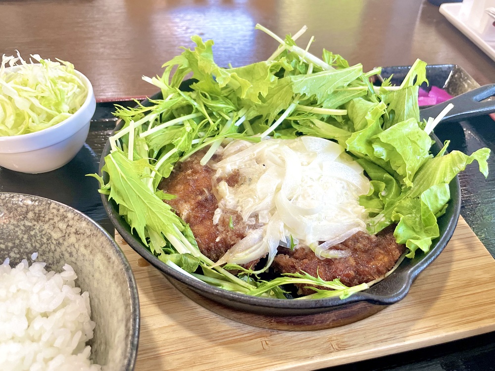 その下には、鉄板いっぱいに広がったボリューム満点のソースチキンカツがどっしりと控え、湯気とともに食欲をそそる香りが立ちのぼります。