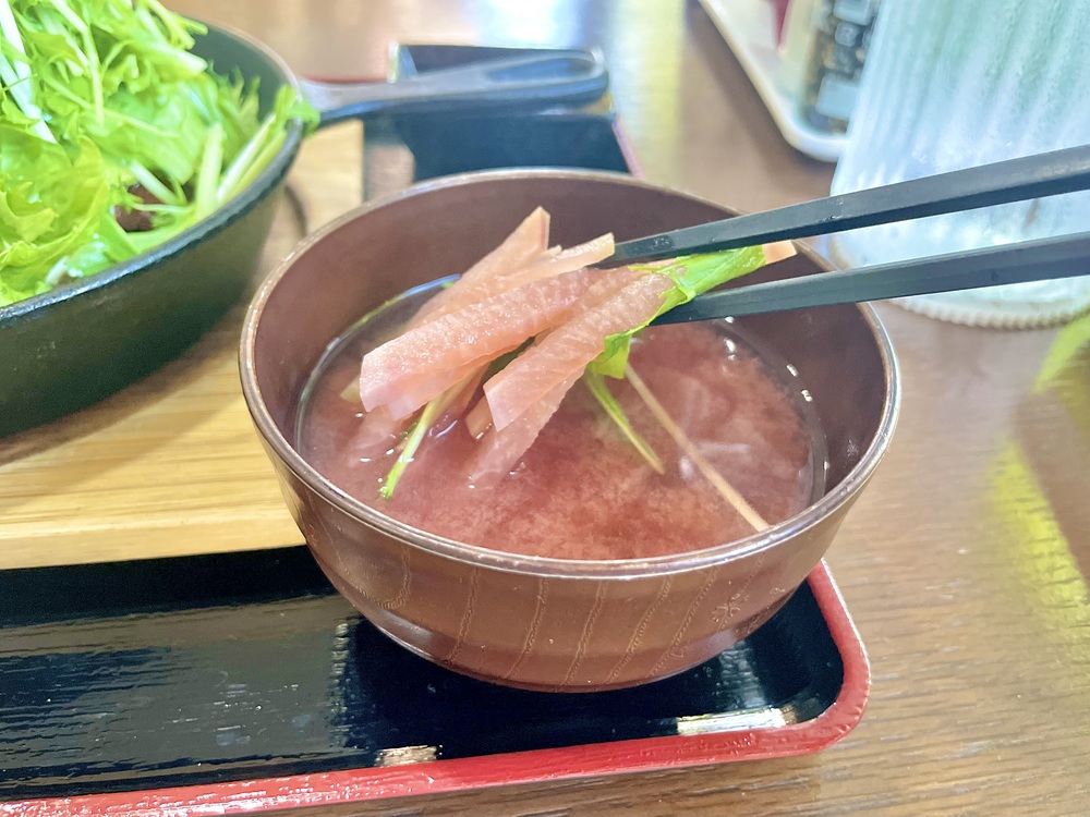 この日の味噌汁には、細切りの紅大根がたっぷり入っており、見た目もかわいらしく、出汁の効いた優しい味わいに紅大根の甘みが加わって、まさに絶品。