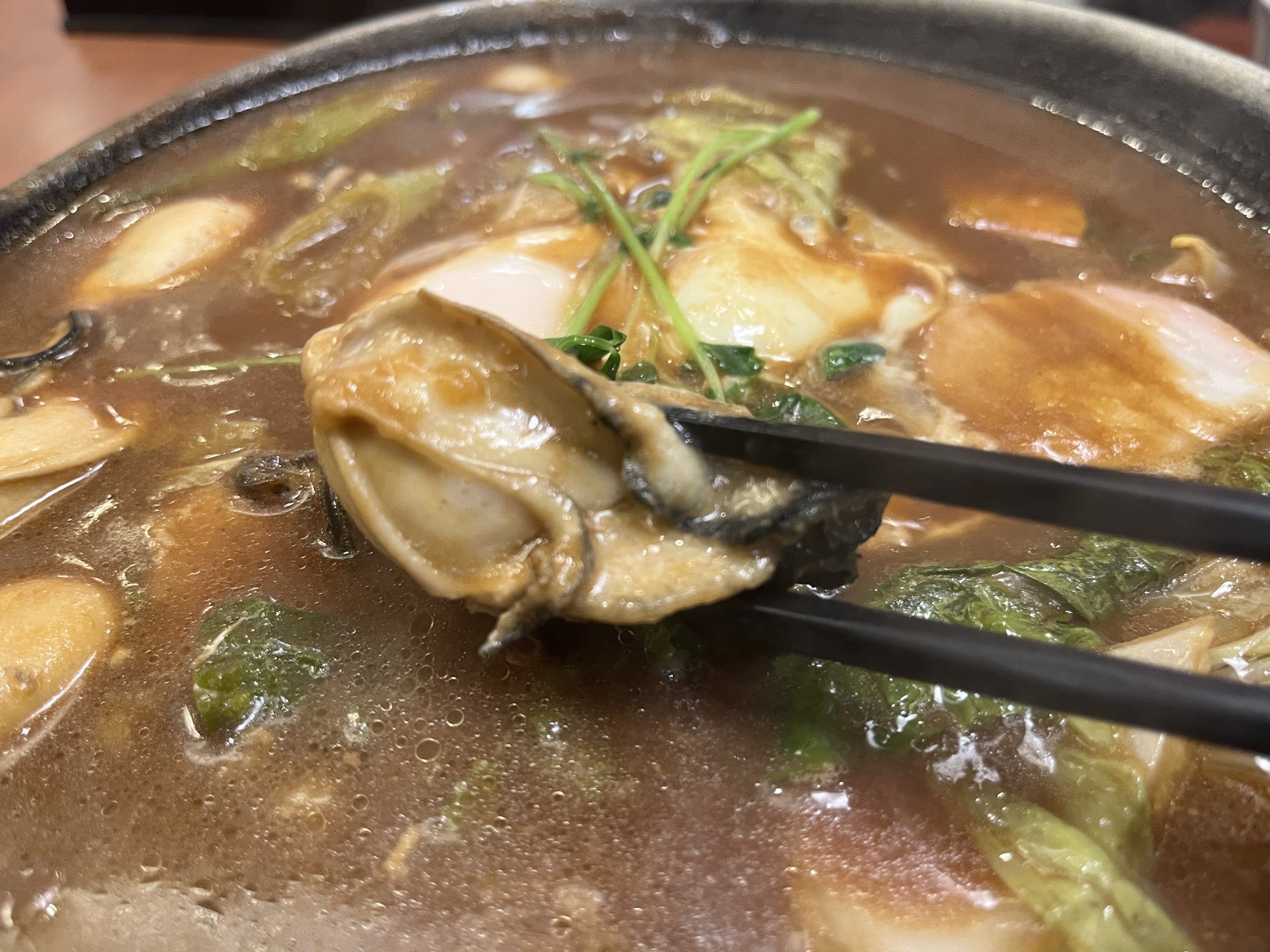 鍋の中には大粒の牡蠣をはじめ、白菜やネギ、カボチャ、カイワレ、たまごなどたっぷりの具。牡蠣を持ち上げてみると、その名の通り大粒でぷりっぷり!ちなみに「ぷりぷり牡蠣みそ煮込みうどん」は牡蠣が3粒とのことですが、特選の方は倍量は入っていたと思われます(数え忘れました)。