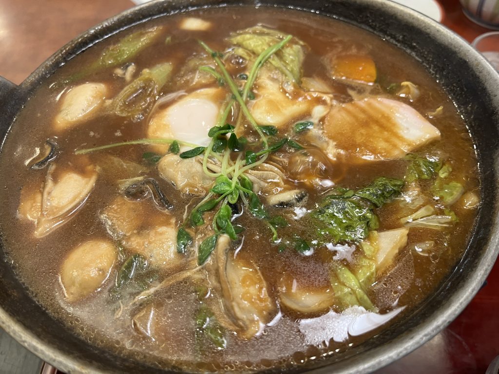 太めのうどんももっちもちで、みその濃厚な味わいの中に牡蠣や野菜のうまみが凝縮され、おいしかったです!熱々を、ハフハフ汗をかきつつ食べ進めました。