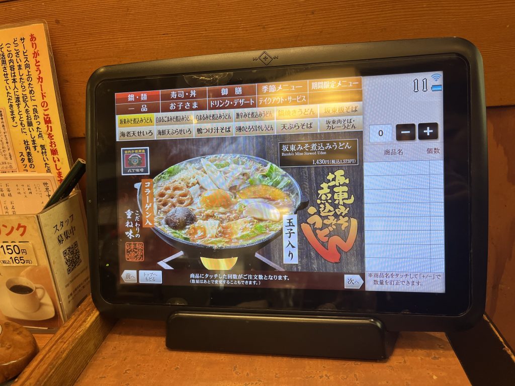 お店はオープンな作りになっており、座敷とテーブル席があります。注文はタブレットをから。