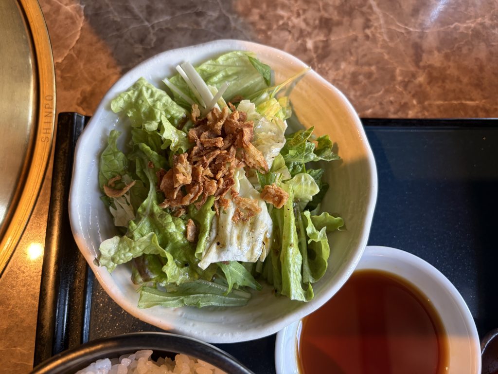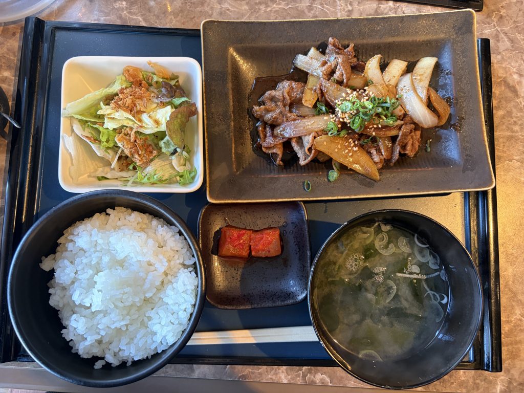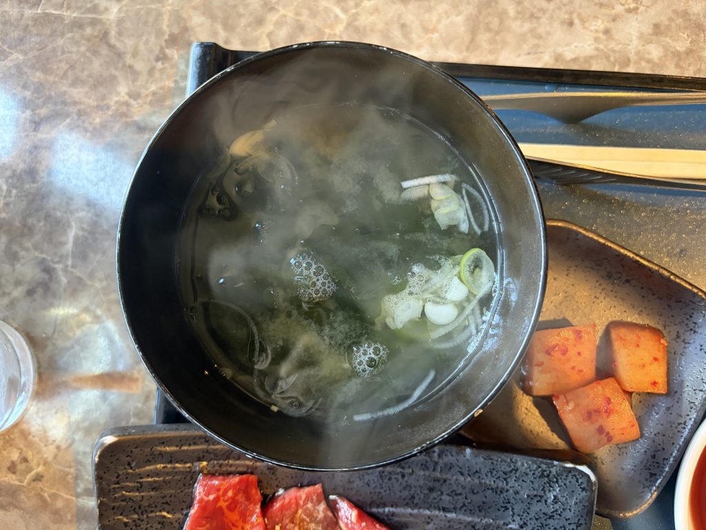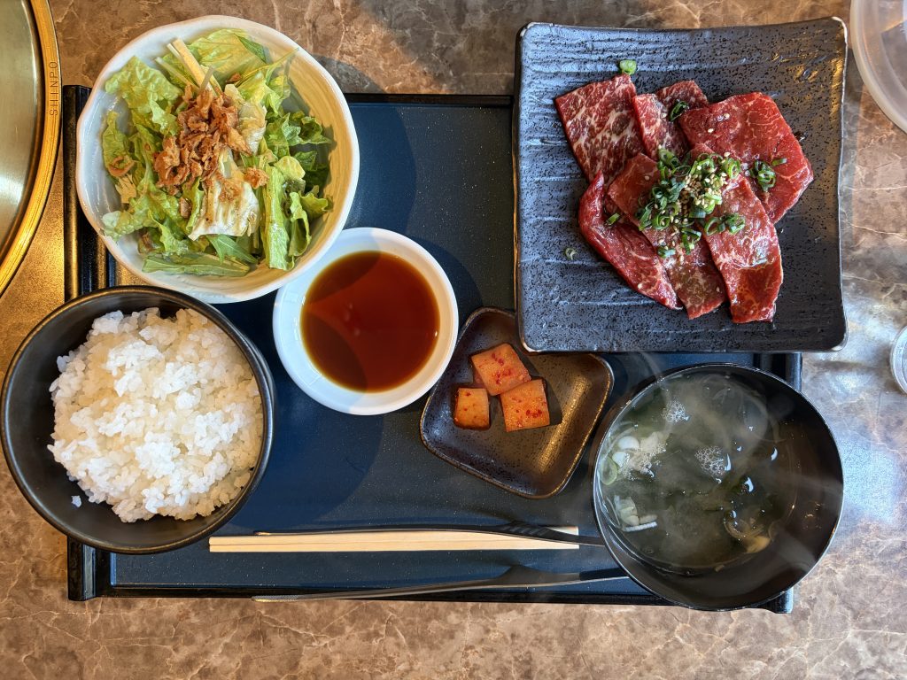 ご飯にわかめの味噌汁、サラダ、カクテキ、そしてメインのカルビ焼。