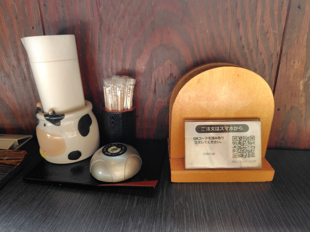 注文はQRコードをスマホで読み取ってするスタイルですが、呼び出しボタンで注文も可能なのでガラケー派の方でも安心です。