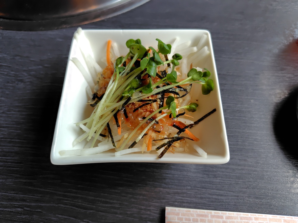 次に運ばれてきたのがサラダです。ダイコン、ニンジン、カイワレ大根にかつお節ときざみのりがのっています。
